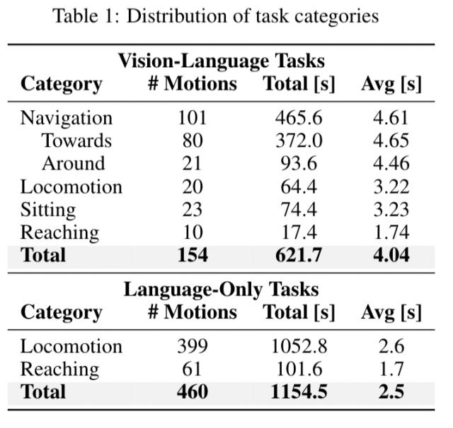 LeVERB-Bench 包含多种任务类别,如导航(Navigation)、走向目标(Towards)、绕物体移动(Around)、移动(Locomotion)、坐下(Sitting)、伸手够物(Reaching)等。