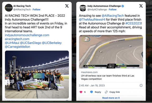 AI Racing Tech 在 2022 年的美国印第安纳波利斯自动驾驶挑战赛中夺得亚军,在 2023 年夺得季军。