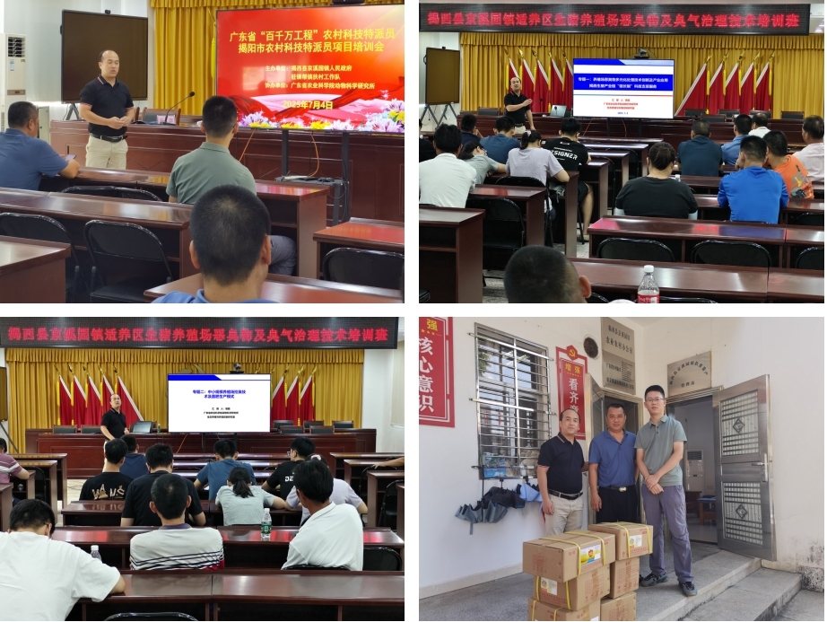 培训会上,广东省农业科学院动物科学研究所派驻专家容庭分别做了两个专题培训,其中专题一:养殖场恶臭物多元化处理技术创新及产业应用。分别围绕当前生猪养殖恶臭物与臭气排放、治理技术等存在的弊端,提出构建从“源头减排—过程控制—末端消减”多元化治理技术方案,即源头改善生猪肠道营养物质的吸收,减少恶臭物生成;过程通过提高臭气吸收和恶臭物降解效率,减少恶臭物传播,末端定向控制养殖粪污微生物代谢,减少恶臭物积累。专题二:中小规模养殖场控臭技术及菌肥生产模式,提出经济实用臭气治理和菌肥发酵生产技术方案,内容通俗易懂,且紧贴生产实际,受到广大养殖户高度认同。正值夏季高温天气条件,生猪疫病多发的关键时期,特派员也派送了一批消毒防疫物资,并向镇畜牧负责人刘文峰站长和农办主任王继盛讲解其使用对象与使用方法。