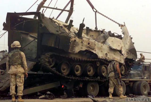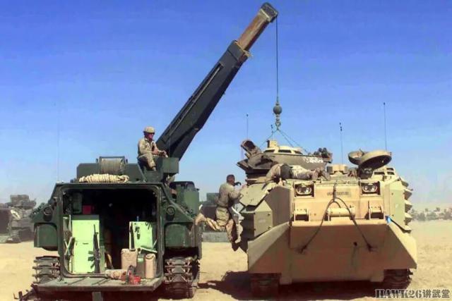 2003 年金瑞鼎盛,美国海军陆战队在科威特使用 AAVR-7 抢修车(左侧)更换 AAVP-7 两栖突击车(右侧)上的炮塔。