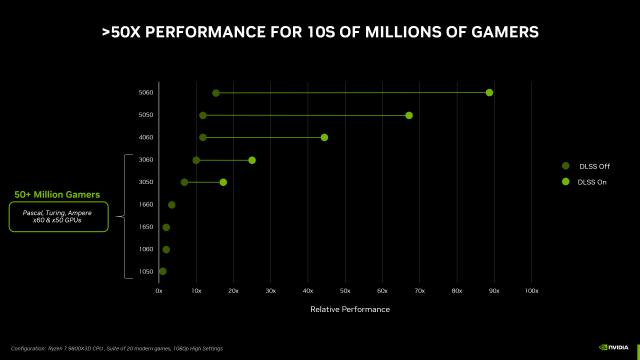 相比爆款 RTX 3050,GeForce RTX 5050 GPU 的光栅化性能(分辨率 1080P)平均提升 60%,在支持全套 DLSS 4 技术的游戏中,带来高达 4 倍的性能提升。