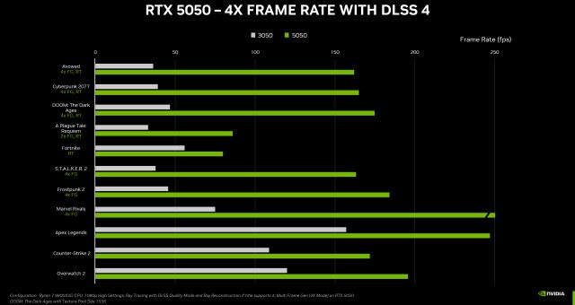与 RTX 3050 笔记本电脑 GPU 相比,GeForce RTX 5050 笔记本电脑 GPU 的光栅性能平均提升 2.4 倍,并在支持 DLSS 4 多帧生成的游戏中,带来 4 倍以上性能提升。