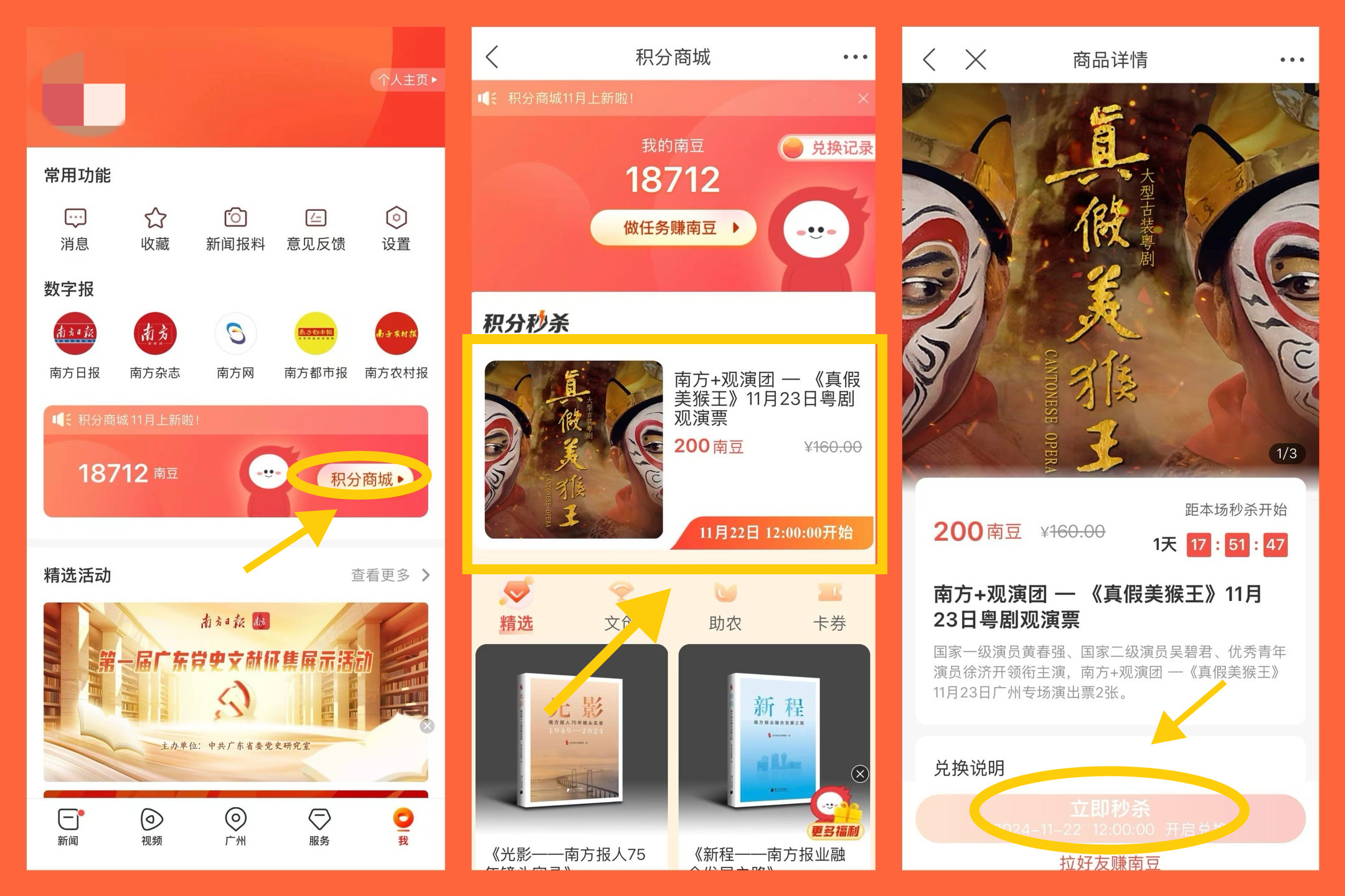 11月22日12时,参与南方+积分商城秒杀活动,仅需200南豆积分,即可获得2个观演名额。