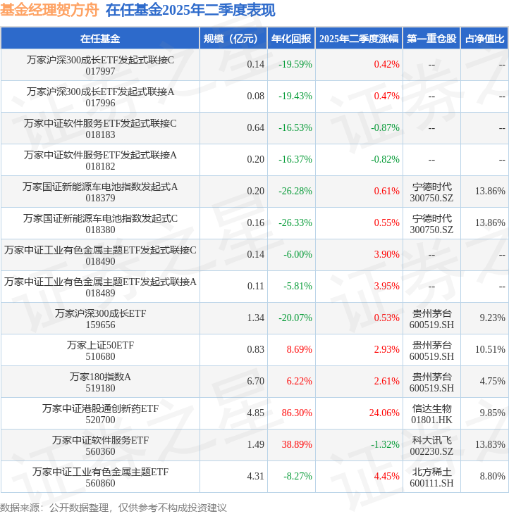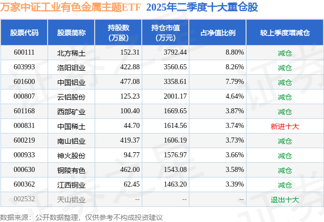 从基金规模来看,万家中证工业有色金属主题ETF基金2025年二季度公布的基金规模为4.31亿元,较上一期规模5.95亿元变化了-1.64亿元,环比变化了-27.57%。该基金最新一期资产配置为:股票占净值比99.34%,无债券类资产,现金占净值比0.87%。从基金持仓来看,该基金当季前十大股票仓位达51.46%,第一大重仓股为北方稀土(600111),持仓占比为8.8%。