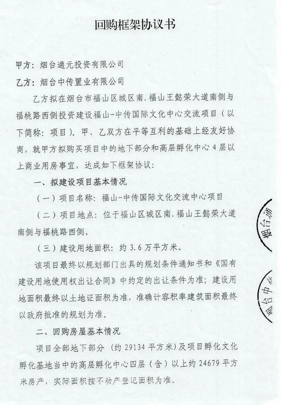 烟台通元公司在起诉书中称,2017年9月8日,其与烟台中传公司签订《回购框架协议书》,就烟台中传公司投资建设的中心项目中的地下部分和高层孵化中心4层以上商业用房的回购事宜达成一致,协议对回购房屋价格、交付期限、交付标准、付款时间等都进行了约定。