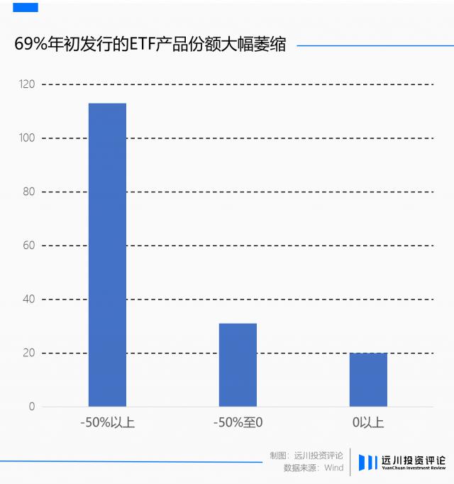 以今年上半年发行的 ETF 为例,根据 Wind 数据显示,截至 2025 年 7 月 22 日,年初以来累计发行的 164 支 ETF 产品中,有 144 支产品的产品份额有所萎缩,其中 113 支产品的份额跌幅更是达到 50% 以上,仅有 15 支产品份额实现了增长。