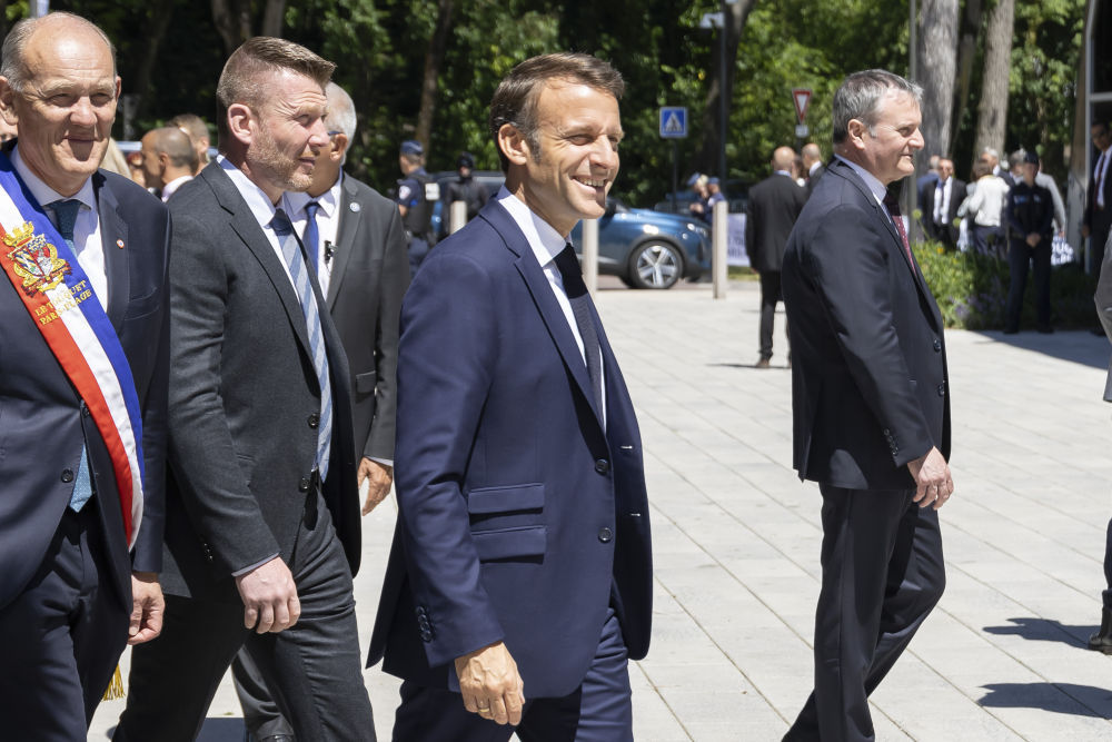 6月9日,在法国勒图凯市一处投票站外,法国总统马克龙(右二)在参加欧洲议会选举投票前与民众交流。图片来源:新华社发(弗兰克·博阿姆摄)